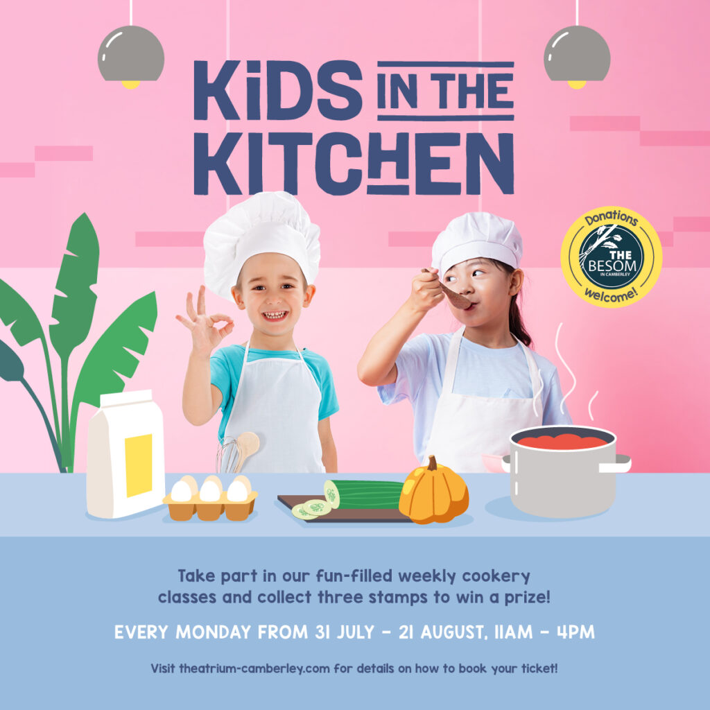 Entry to ‘Kids in The Kitchen’ is FREE, but we are collecting food donations which will be donated to The Atrium’s nominated charity, THE BESOM, Camberley’s Food Bank.